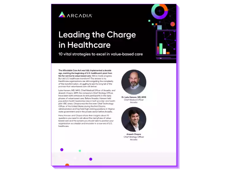 Download Arcadia’s latest white paper, Leading the charge in healthcare: 10 vital strategies to excel in value-based care, to discover the key traits and tactics that differentiate VBC trailblazers. This practical guide offers proven insights drawn from Arcadia’s deep partnerships across the U.S. and uncovers how leading healthcare organizations are designing scalable, future-ready programs.